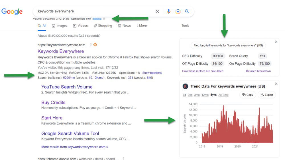 Keywords Everywhere is a browser add-on that displays keyword data on top of Google Search, YouTube, and other platforms.