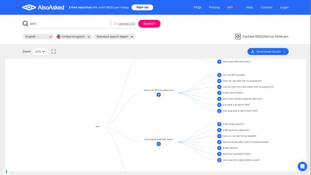 AlsoAsked explores how topics branch out from initial search questions, providing deeper insights into user queries. At Bird, we have utilized the free version of AlsoAsked on several projects to efficiently generate a comprehensive list of relevant questions for our clients’ strategies. This feature is particularly handy as it allows us to gather all necessary data in one run, enhancing our understanding of audience needs and improving content relevancy.