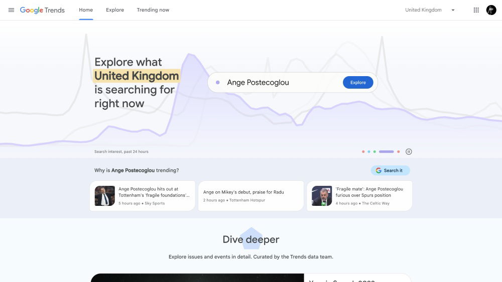 Google Trends analyzes the popularity of top search queries across various regions and languages, offering a graphical representation of historical data and trends. At Bird, our team uses Google Trends extensively to find trending topics for our clients. The remarkable thing about it is that it’s completely free, providing invaluable insights without any cost. It’s also good to see if a client’s niche or services could be in decline, leading to fewer inquiries and affecting overall strategy.