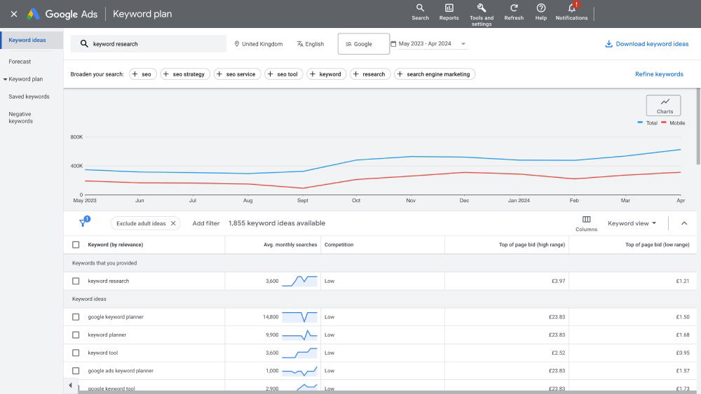 Google Keyword Planner is designed for advertisers but is also extensively used by our team at Bird for both SEO and PPC research. We prefer this tool over others primarily because it utilizes Google’s own data. While the free version provides a range of data, investing in a small Google Ads campaign, even just $5/£5, unlocks full data access for each keyword. This makes it a valuable investment for gaining precise insights that significantly enhance our campaign strategies.