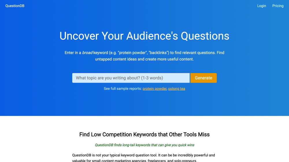 QuestionDB sources questions from the web to help users create content that answers popular queries.