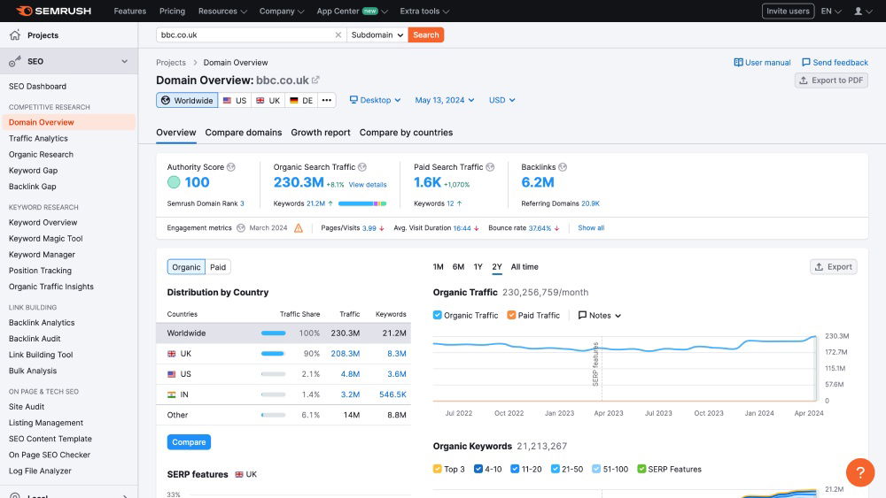 - Services Offered: Keyword tracking, domain overview, and content ideas.