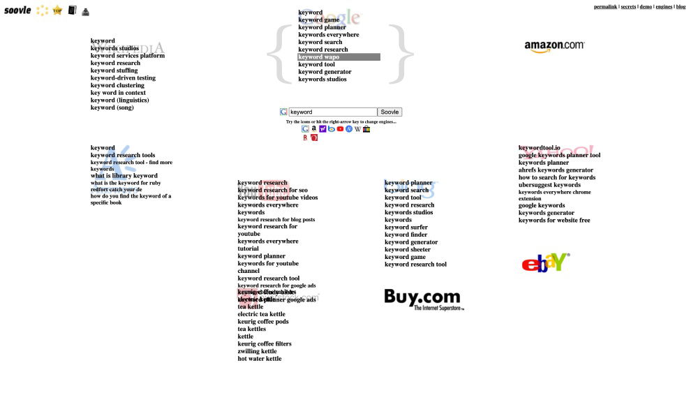 Soovle is a customizable engine that aggregates keyword suggestions from major platforms like Google, YouTube, Bing, and more.