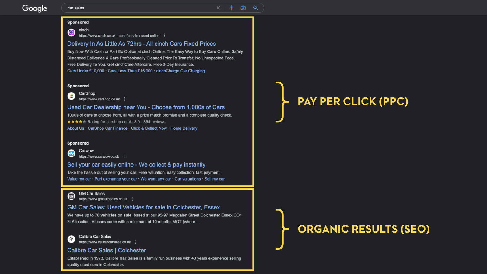 Organic search results are earned through SEO, while paid search results are achieved through PPC advertising.